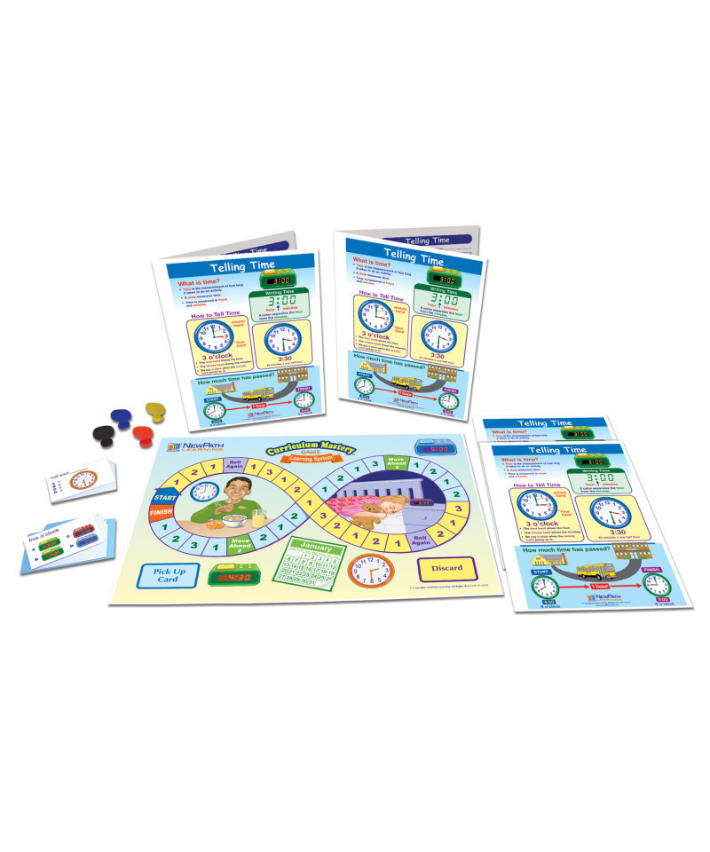 The Telling Time Learning Center provides materials for 4 students and includes 1 Curriculum Mastery Game (featuring 1 Set of 30 illustrated self-checking question cards and 1 Laminated double-sided game board & game pieces for up to 4 players), and 4 Visual Learning Guides focused on the same topic.