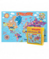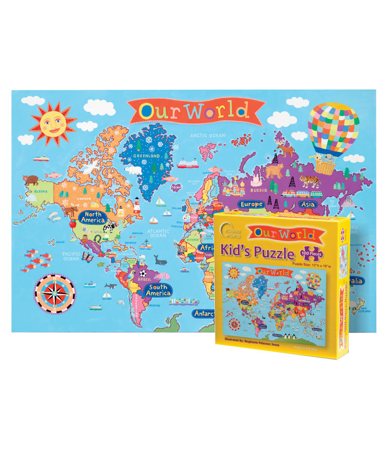 This kid's 100 piece jigsaw puzzle of the World features fun, beautiful artwork that teaches kids about the world. Finished size is 13"x19". Solid quality pieces in a sturdy puzzle box.
