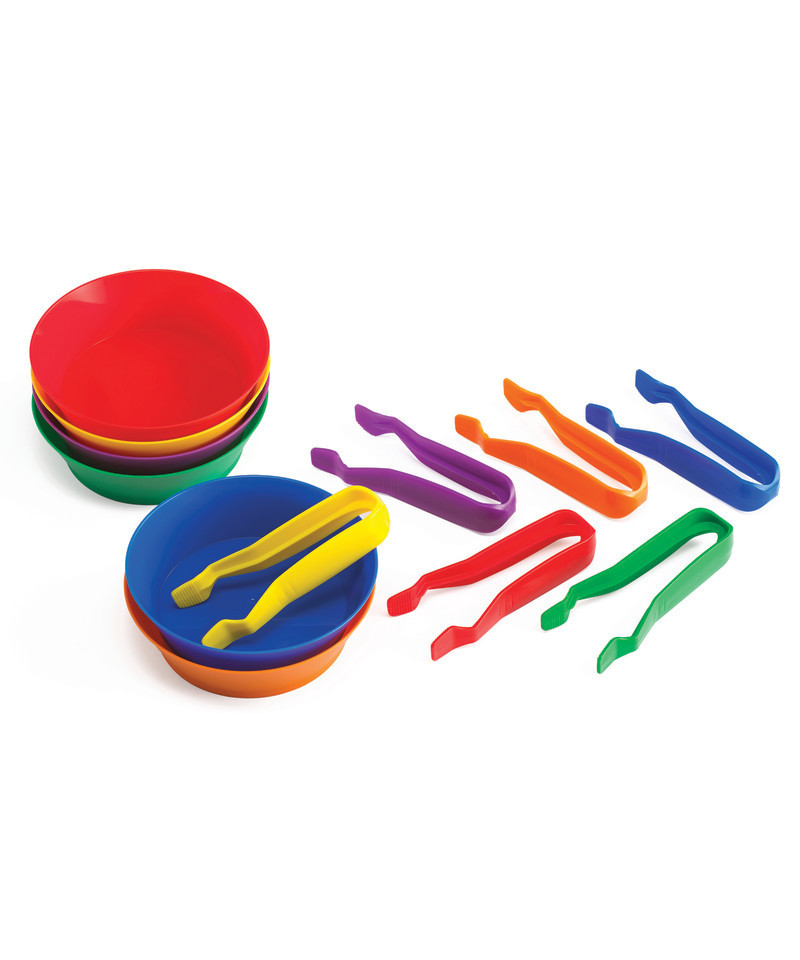 - SET OF 6 JUMBO TWEEZERS AND 6 SORTING BOWLS -- This set includes 6 plastic toddler tweezers (4.5"L) and 6 plastic bowls (5.25" dia.) in 6 colors: blue, green, red, yellow, orange and purple.