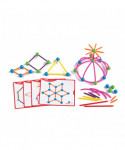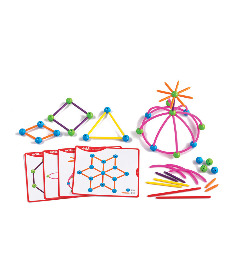 Skeletal Starter Geo Set doubles as an introductory math manipulative for hands-on discovery of 2D and 3D geometry principles. Construction set which will improve children's fine motor skills, as well as develop their creative and problem solving skills. Build two and three dimensional structures. Introduces children to basic geometric shapes. Model 2D shapes, 3D structures and inspire imaginative design with 20 double-sided activity cards. Set includes 80 sticks in 4 sizes and 4 colors, 40 connecting balls in two colors, 24 quarter circles, and 20 x 2-sided full-color activity cards in sturdy plastic container.