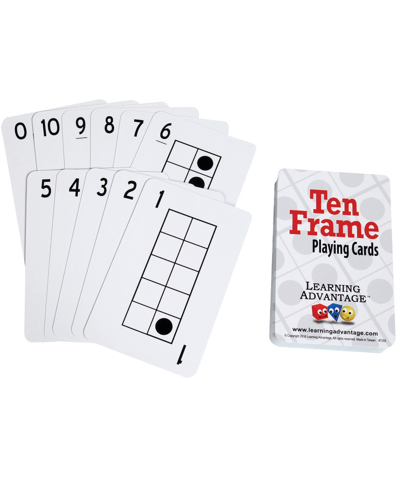 This standard size deck of playing cards is printed with Ten Frames to help students to see the different combinations that make 10 and to internalize the value of these numbers and their relationships. Ten Frames are one of the most important materials to help student visualize the anchor number of 10. Playing cards can be used with large groups, small groups, partners, individuals or in centers. Contents: 46 cards: 4 sets of Ten Frame cards (dots with frames) for 0-10. Suggested activities included.