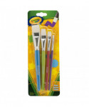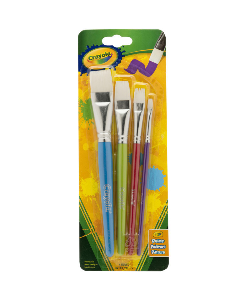Paint broad strokes on posters and signs and fine lines on art and crafts. This set of flat paintbrushes is ideal for a variety of kids' school projects, signage, paintings, and more. The brushes feature brushed silver ferrules and measure from 1 inch wide to 1/4 inch wide. With four brushes in different sizes, kids can paint an array of lines and strokes. The 4-3/4-inch wooden handles are a good fit for kid-size hands. Each handle has its own vibrant color. Featuring soft, white Taklon bristles to show paint's true color, the brushes are ideal for use with water-based paint such as Crayola Washable Paint, Tempera Paint, and Acrylic Paint. Recommended for ages 3 and up. Each pack includes 4 flat paintbrushes.