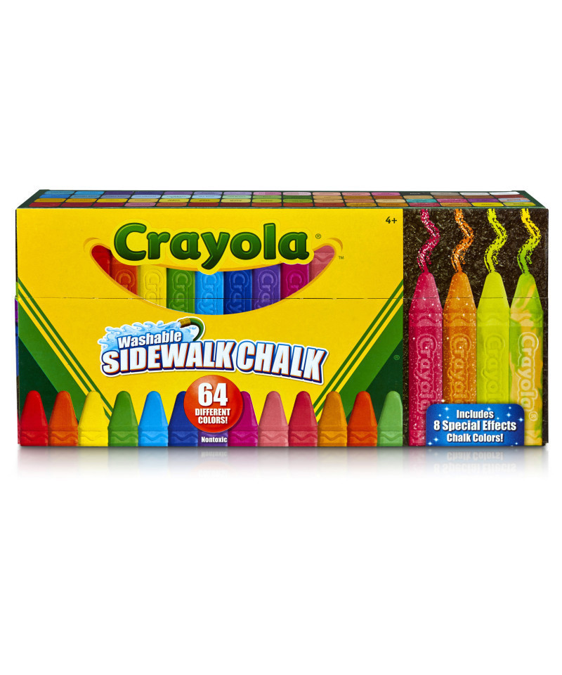 This collection includes a total of 64 chalk sticks made up of 56 vibrant hues and eight special-effects chalk sticks (2 each of tie-dye, neon, glitter, and neon glitter) so you can unleash your imagination and create all kinds of drawings and designs. The sticks are also great for writing messages or marking out hopscotch and other games. Designed for ages four and up, the sticks have easy-grip bodies that hands of all sizes can handle and hold. Triangular tips help ensure smooth lines from all angles. Kids can also use the sides of the stick to shade or color in larger areas. The Crayola Washable Chalk Collection gets kids excited about spending time outside being creative. This interactive chalk kit encourages outdoor fun with friends and provides kids with an activity that helps them become more active, social, and creative. Whether drawing on the sidewalk, blacktop, or driveway, this chalk brings the fun outdoors. The nontoxic chalk in this Crayola set completely washes away easily from sidewalk, blacktop, and driveway surfaces with water from a garden hose, bucket, or rainfall. Each pack includes 64 chalk sticks (56 classic colors and eight special-effects colors).