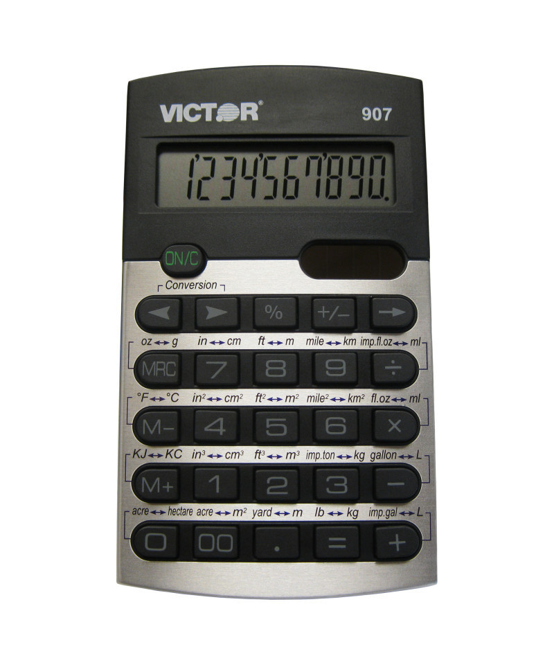 The Victor 907 features 20 built-in metric conversion functions including: length, area, capacity, weight, volume, energy and temperature conversions. Navigate through equations with ease using percent, change sign, square root keys, and more.