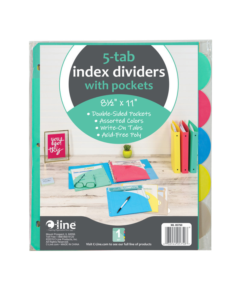 Tabbed poly index dividers organize your binder instantly. Made from durable, archival quality polypropylene. Fits standard 3-ring binders. Includes double-sided easy-load slant pockets to allow for extra storage of documents and media. Assorted colors include Seaside Blue, Sunny Yellow, Seafoam Green,and Sunset Red.