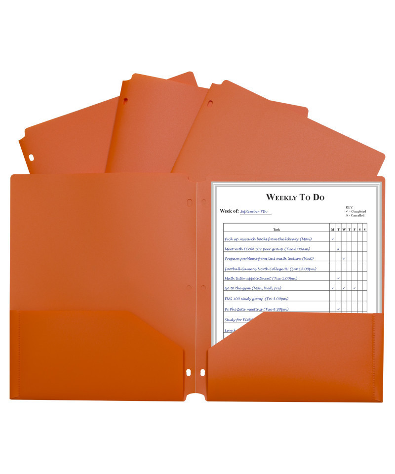 Need some help keeping your three-ring binder in order? With the help of these specialty two-pocket folders, letter-size papers can stay organized, while still remaining accessible. Two-pocket heavyweight polypropylene portfolios/folders with three-hole punch hold papers and resist tearing. Features three-hole punching for secure storage in standard 3-ring binders. Cut-outs at the top and bottom keep portfolio from being caught in binder open-close mechanism. Orange. Sold individually.