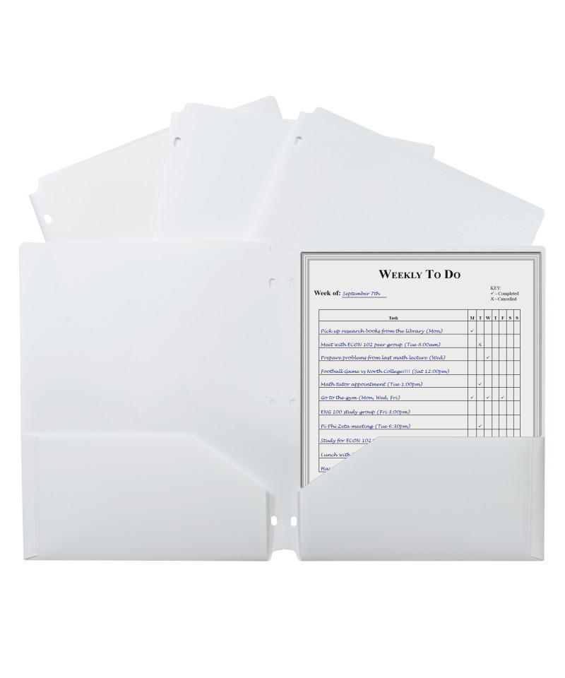 Need some help keeping your three-ring binder in order? With the help of these specialty two-pocket folders, letter-size papers can stay organized, while still remaining accessible. Two-pocket heavyweight polypropylene portfolios/folders with three-hole punch hold papers and resist tearing. Features three-hole punching for secure storage in standard 3-ring binders. Cut-outs at the top and bottom keep portfolio from being caught in binder open-close mechanism. White.