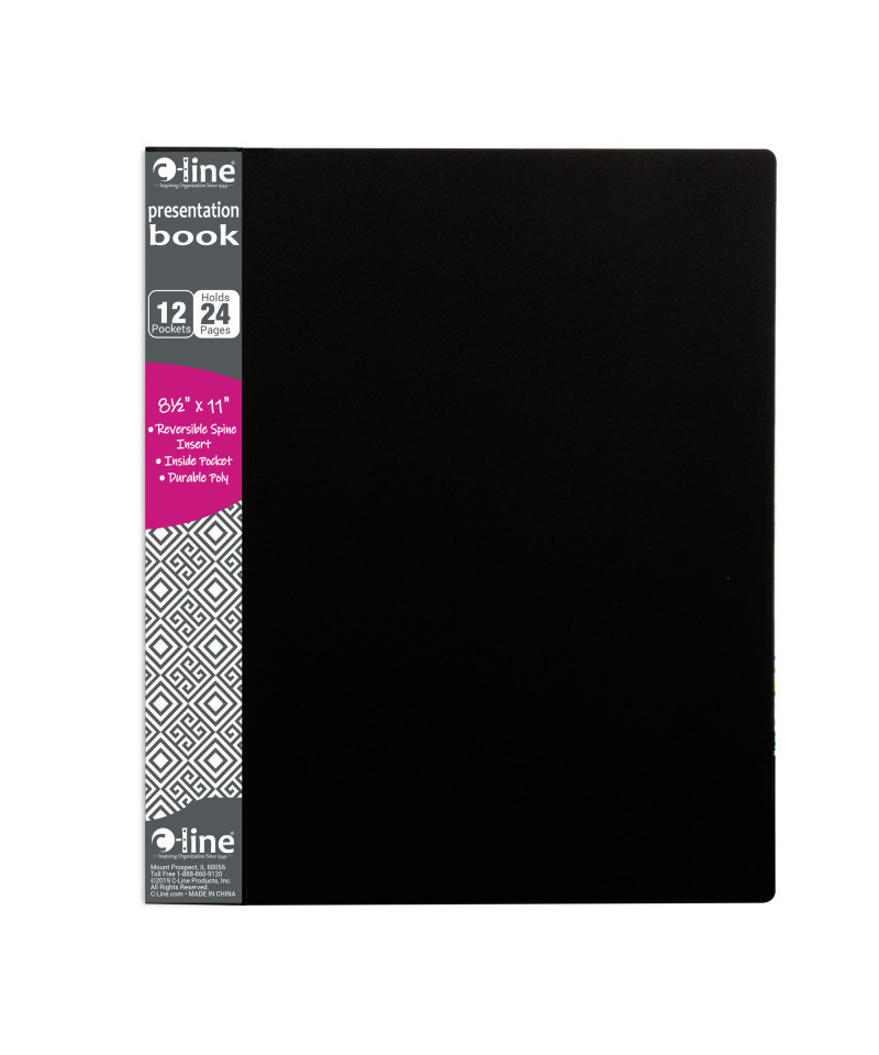 Protect important documents, while creating a presentation book in minutes. Using the presentation book can help reduce time spent on creating a professional-looking hand-out. Instead, present your report, project or artwork in style with this presentation book. Features twelve bound-in clear top-loading polypropylene sheet protectors that lie flat while the book is open. Storage pocket on inside front cover holds extra materials. Clear-view spine insert is reversible for instant customization. Holds up to 24 pages. Acid-free. Black.