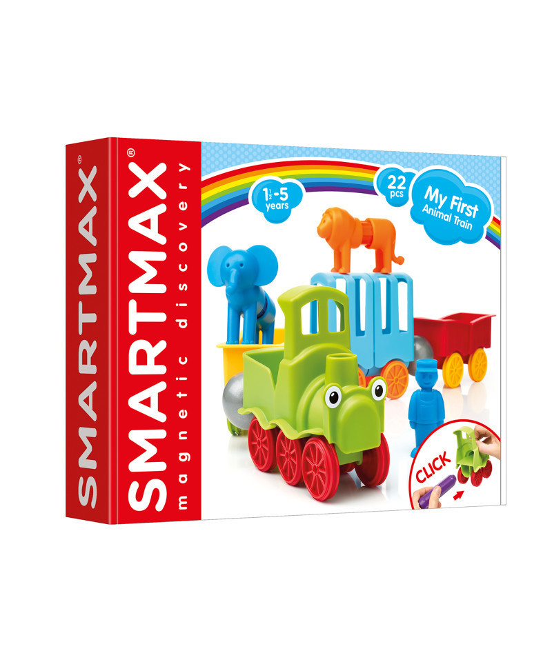 Young children can safely discover the magic of magnetism with the SMARTMAX "My First" collection. My First Animal Train features and extra-large train and animal parts that easily click onto SMARTMAX bars. Build & drive your own train, play with the animals and the Conductor or "mix & match" to create the craziest combinations! All parts are compatible with all other SMARTMAX sets. Each set includes 22 pieces: 4 Large Bars, 2 Small Bars, 3 Metal Balls, 2 Lion Parts, 2 Elephant Parts, 2 Green Locomotive Parts, 2 Blue Closed wagon parts, 2 Yellow Open wagon parts, 2 Red Open wagon parts, and 1 Driver.
