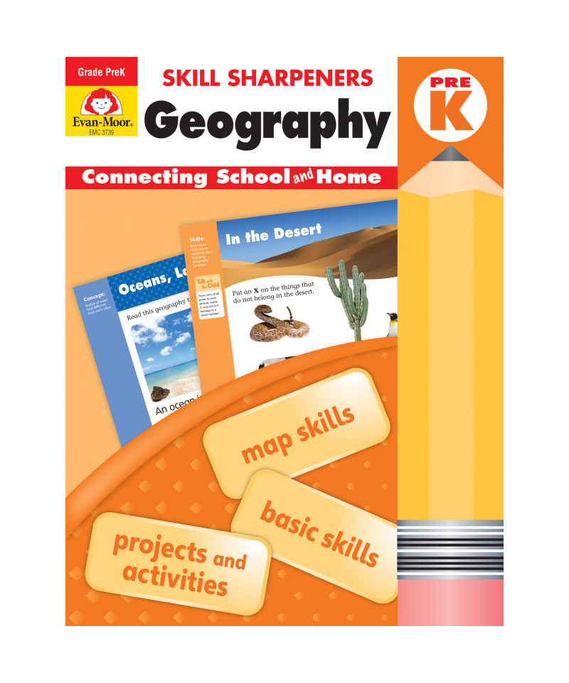Skills Sharpeners: Geography engages your child in exploring the world while learning important map skills and geography concepts. The cross-curricular activities integrate the most current geography standards. Each geography topic includes nonfiction reading selections, comprehension questions, vocabulary practice, writing prompts, and authentic activities that bring the concepts to life. These activities invite your child to be creative while using higher-order thinking skills. Includes answer key. The PreK title incorporates geography concepts and themes into basic skill practice and includes hands-on activities and art projects.