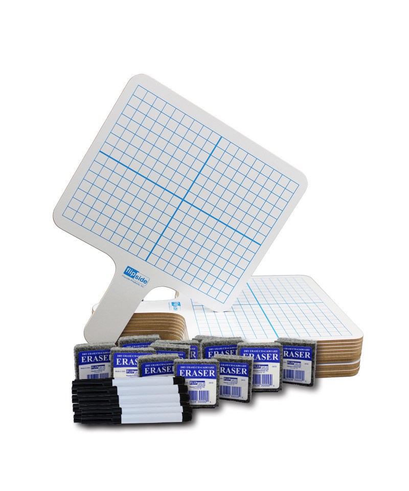 The two-sided rectangular dry erase graphing paddles are ideal for quick responses or lessons. One side features a graph with 3/8" squares, reverse side features a blank dry erase side. Each class pack includes 12, includes 12 paddles, 12 erasers, and 12 dry erase pens. Each paddle measures 7.75" x 10" and 1/8" thick.