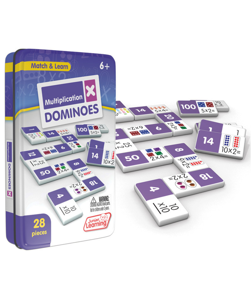 Multiplication dominoes include a 28 piece set on thick plastic dominoes. Dominoes come in a collectors tin for storage. Children will love the feel of real dominoes as they complete the numeracy matching game.
