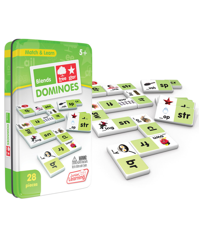 Blend dominoes include a 28 piece set on thick plastic dominoes. Dominoes come in a collectors tin for storage. Children will love the feel of real dominoes as they complete the blend matching game.