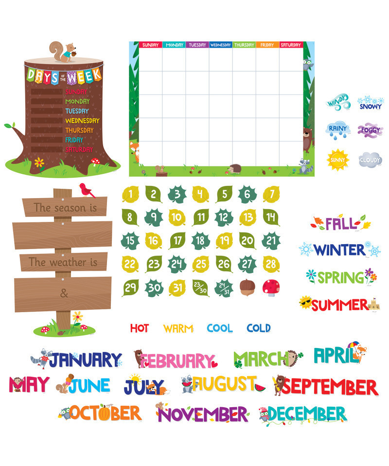 Bring a bit of the outdoors in with this Woodland Friends Calendar Set Bulletin Board! The friendly woodland animals (fox, hedgehog, bear, squirrel, rabbit, raccoon, and deer) and the woodsy scenery create a colorful calendar display that students will love. Each 67-piece calendar set features a calendar chart, 12 month headlines, 31 pre-numbered calendar days (different colored leaves that form an ABC pattern), and 4 blank calendar days. The set also includes a days-of-the-week chart, a seasons and weather chart, and coordinating labels.