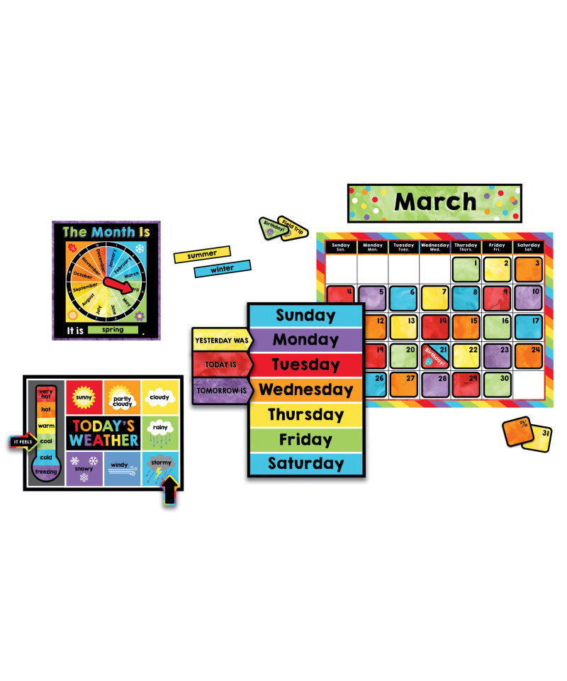 - The 86-piece Celebrate Learning Calendar bulletin board set provides everything you need to create a display that helps students stay up-to-date with days, months, seasons, holidays, and more.