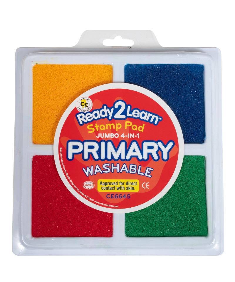 Stamp and create with this Jumbo 4-in-1 Washable Stamp Pad! This stamp pad includes 4 separate ink pads of red, yellow, green and blue ink. Made of non-toxic ink, this stamp pad is safe for ages 3+. The ink is acid-free and fade resistant for archival quality, which means you can store your little artist's creations forever! An open-ended tool to decorate scrapbooks, notebooks or cards, this stamp pad inspires creative expression and imagination. As children stamp, they will develop fine motor skills and hand-eye coordination. The ink will wash off skin with soap and water. Size of each color: 2.9"L x 2.9"W.