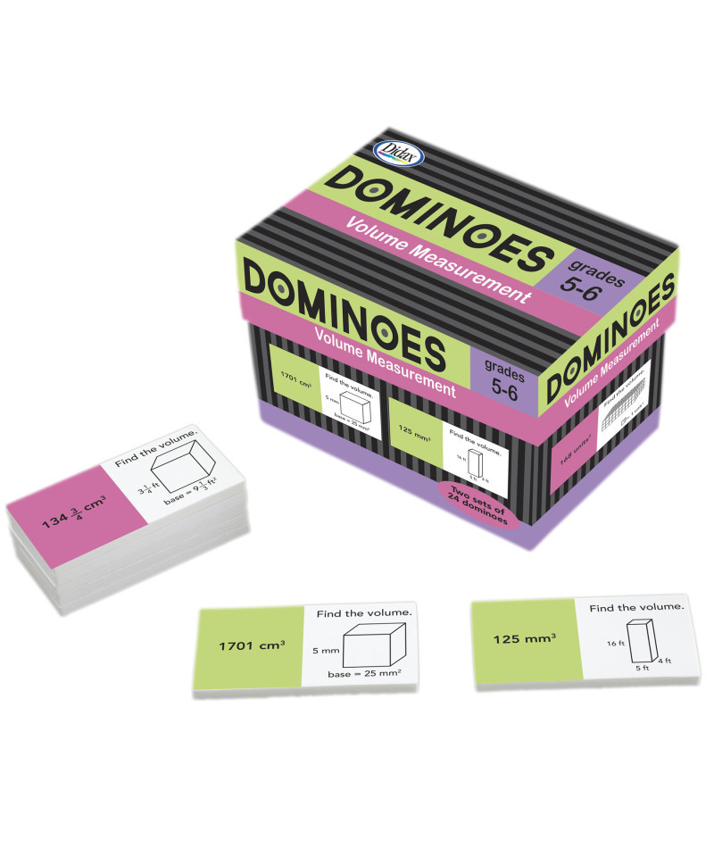 Finding the volume of a solid figure is much more interesting with dominoes! In one set players use formulas to match the written notation of volume to diagrams labeled with dimensions. In the second set players use spatial reasoning to match diagrams of centimeter cubes to the written notation of volume.
