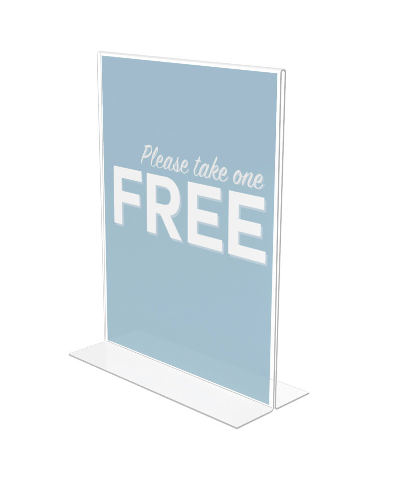 Value priced light duty freestanding plastic T-frame sign holder lets you display signs where you need them most. Two sided for double the impact. Bottom loading. Use on counter or desk. Literature slides in from the bottom.