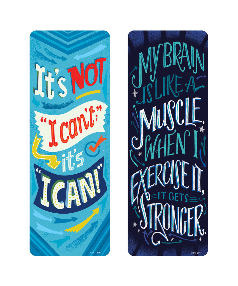 Bookmark 1: It's not, "I can't;" it's "I can!" Bookmark 2: My brain is like a muscle. When I exercise it, it gets stronger. Each pack includes 30 bookmarks, 15 each of 2 designs. Bookmarks measures approximately 2.5" x 7".