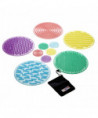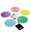 Set of 10 textured circular disks made from ultra-soft flexible silicone – 5 large (13.75" diameter) and 5 small (3.15" diameter). On the surface of each circle is a pattern which is distinctive and different from the rest of the set. Children can feel these textures and discover their differences: by placing the small circles into the "feely bag" provided, they can see if they can describe or predict the pattern they are feeling; or by using their feet they can walk over the large sensory circles to see if they can tell them apart.