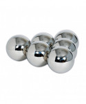 A set of 6 reflective mirror balls that look identical, but all have individual characteristics. Some wobble when rolled, or turn and won't roll in a straight line, some feel funny when twisted, spun or shaken and others make different shaker or rattle sounds. The shiny mirror surface provides a distorted fish-eye lens reflection which is fascinating for children to observe. They are robustly constructed from hard wearing stainless steel, are lightweight, smooth and tactile to handle and can be of particular appeal to children with special needs, or for those requiring inspiration in creative language. Size: 3.94" diameter.