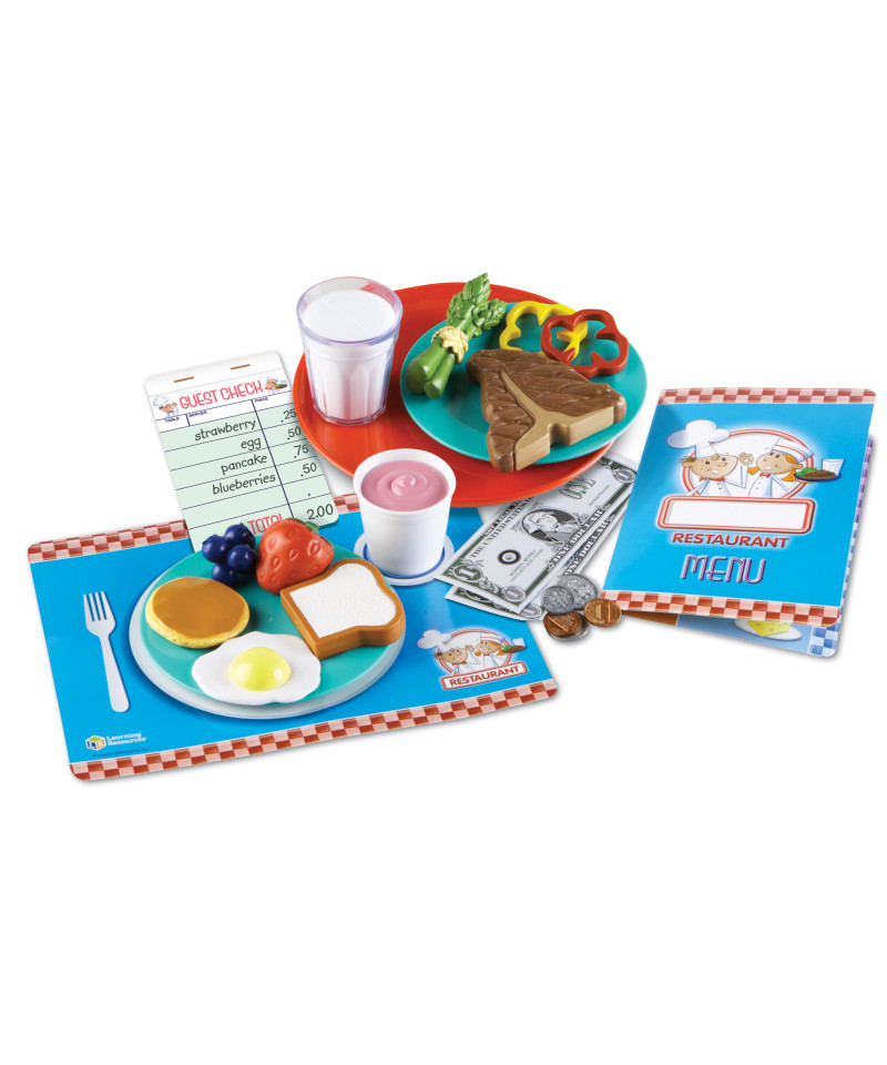 - Pretend menu, play money, and order pad helps kids learn lessons in restaurant etiquette, counting, and social skills