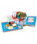 Set of 35 pieces includes 1 serving tray, 2 plastic plates, 10 food pieces, 2 write-and-wipe placemats, 1 write-and-wipe menu, 1 write-and-wipe check, 5 one-dollar bills, and 13 coins. Teaches food groups, counting, early money skills, and role play. Write-and-wipe materials provide reusability factor for repeat play. Placemats combine educational content with fun "restaurant-style" kid-menu activities. Plastic tray measures 8"; placemats measure 11" x 8.5".