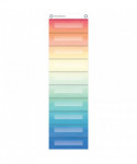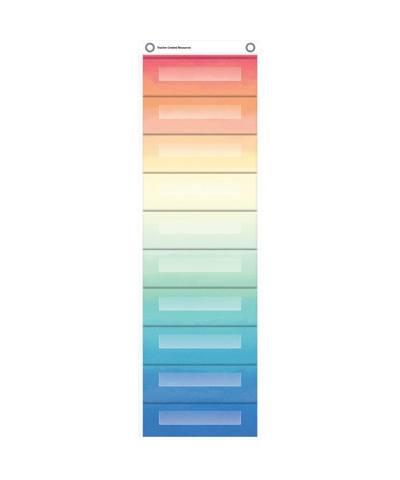 These lightweight and durable pocket charts feature colorful designs and hang easily from sturdy, metal grommets. 10 folder-sized pockets. Clear Label holders. The non-porous surface is easy to clean and can be wiped-down or sprayed with disinfectant to help prevent the spread of germs. Measures 14" x 58".