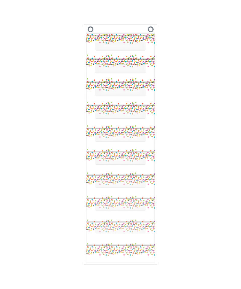 This lightweight and durable Confetti pocket charts features a colorful design and hangs easily from sturdy, metal grommets. 10 folder-sized pockets. Clear label holders. The non-porous surface is easy to clean and can be wiped-down or sprayed with disinfectant to help prevent the spread of germs. Measures 14" x 58".