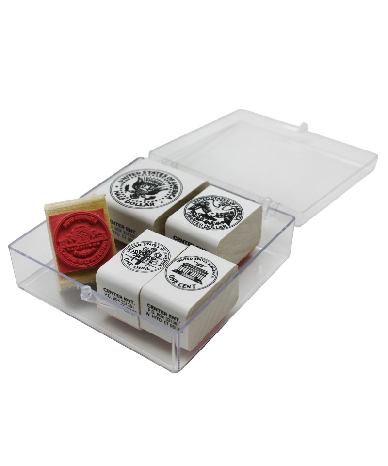 - INCLUDES 5 COIN STAMPS -- This set includes 5 wooden stamps with detailed rubber imprints of the tails side of the penny, nickel, dime, quarter and half dollar.