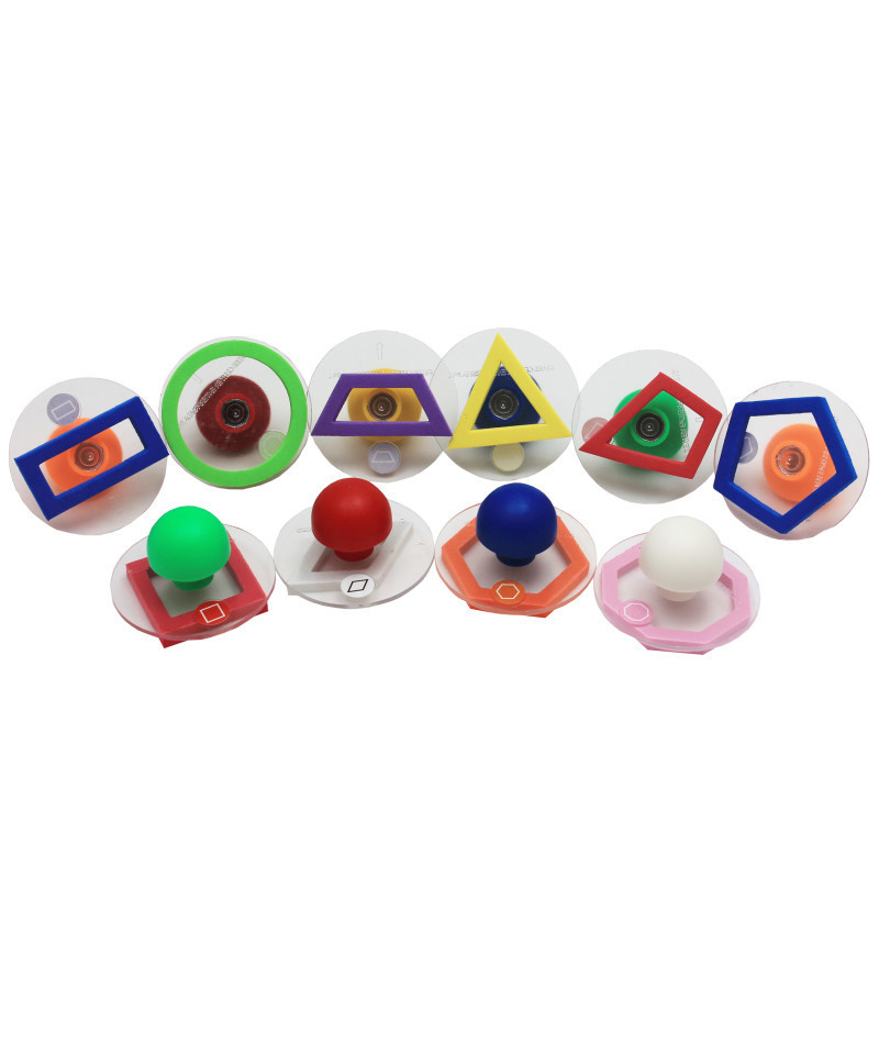 Create lessons and decorate DIY projects with these Giant Geometric Shape Stampers! This 10-piece set includes 10 different geometry-themed outlines: a hexagon, circle, rectangle, square, triangle, rhombus, octagon, trapezoid, pentagon and kite. Each stamp features a large foam shape mounted on a 3" disc for stability. The chunky, rounded handles provide greater comfort and control. Ideal for DIY projects and art and craft time, these giant stampers assist in developing fine motor skills and creativity. Size: 1.9"H x 3" dia.
