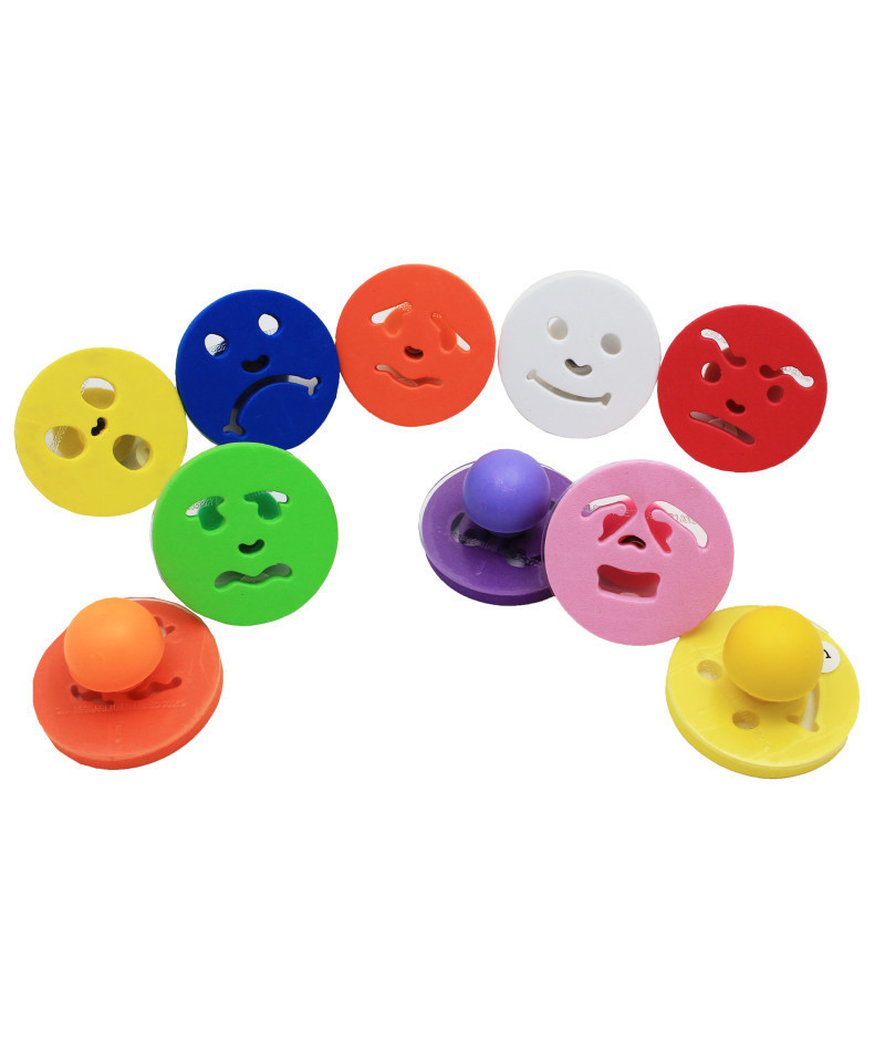 Explore emotions and decorate DIY projects with these Giant Feelings Stampers! This 10-piece set includes 10 different emotion-themed stamps: happy, sad, nervous, surprised, mad, content, scared, tired, sick and confused. Each stamp features a large foam shape mounted on a 3" disc for stability. The chunky, rounded handles provide greater comfort and control. Ideal for DIY projects and art and craft time, these giant stampers assist in developing fine motor skills and creativity. Size: 1.9"H x 3" dia.