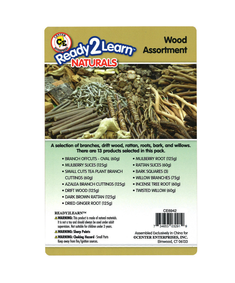 This selection of branches, drift wood, rattan, roots, bark, and willows enables children to explore, discuss and discover the natural outdoor environment. Each pack includes 13 products: Branch Offcuts-Oval (60g), Mulberry Slices (125g), Small Cuts Tea Plant Branch Cuttings (60g), Azalea Branch Cuttings (125g), Drift Wood (125g), Dark Brown Rattan (125g), Dried Ginger Root (125g), Mulberry Root (125g), Rattan Slices (60g), Bark Squares (3), Willow Branches (75g), Incense Tree Root (60g), and Twisted Willow (60g).