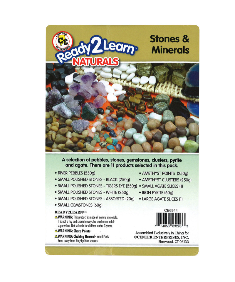 This selection includes 11 different types of stones and minerals: 250g river pebbles, 250g black small polished stones, 250g Tiger's Eye small polished stones, 250g white small polished stones, 250g assorted small polished stones, 60g small gemstones, 250g amethyst points, 250g amethyst clusters, 1 small agate slice, 60g iron pyrite and 1 large agate slice. They have limitless decorating and crafting possibilities! Children will also enjoy the visual and tactile stimulation of stone and mineral naturals. Add Stone and Mineral Naturals to sand and water play, sensory stations and loose parts kits. For ages 3+.