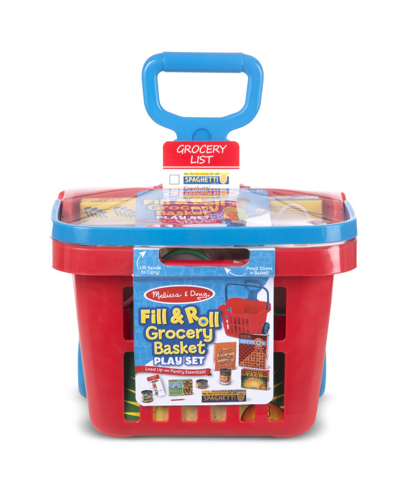 - Load up on play kitchen and grocery store essentials with this durable rolling grocery basket and play groceries