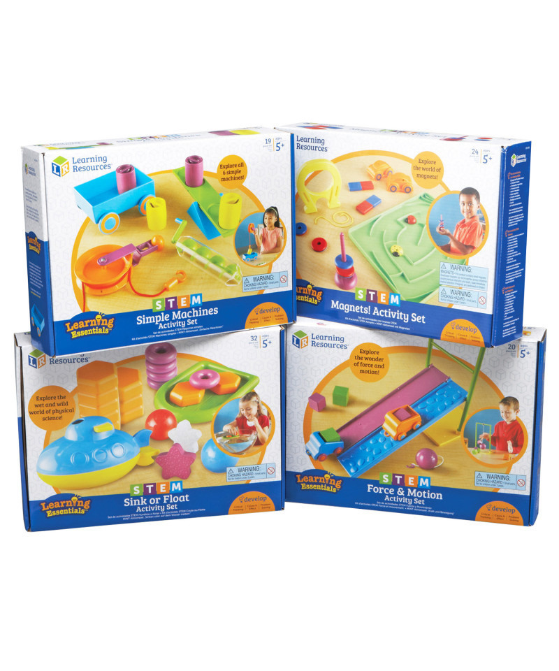 This comprehensive bundle includes four of our finest STEM products including the Force & Motion Activity Set, Simple Machines Activity Set, Magnets! Activity Set, and Sink or Float Activity Set. Explore the wonders of magnetism and engineering, why things sink and float, all 6 simple machines, and the science of "how things go" with colorful, engaging tools and hands-on activities and experiments. The perfect introduction to building key Science, Technology, Engineering, and Math skills. All sets include a comprehensive Activity Guide with reproducible materials. Grades K+/Ages 5+