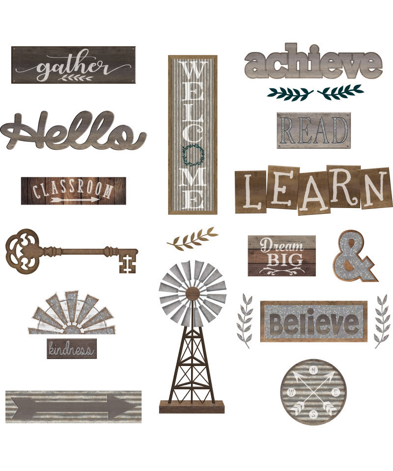 - The reclaimed wood and galvanized metal inspired Wall Décor Bulletin Board set is the perfect way to bring a farmhouse look into your classroom.