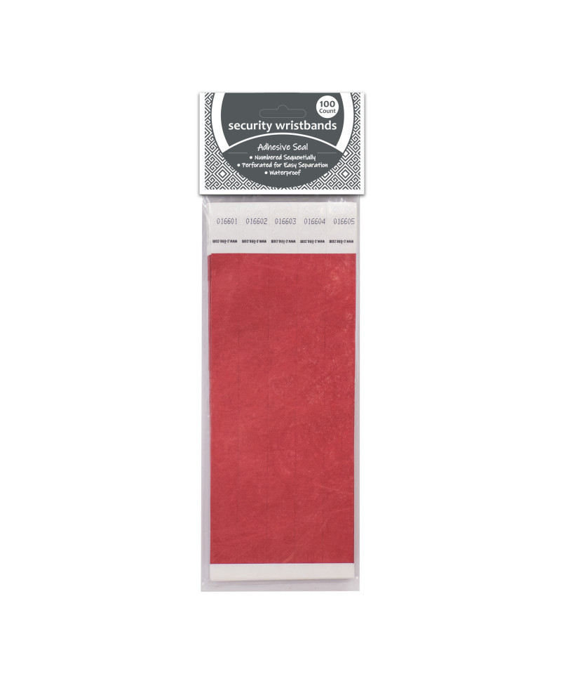 Security wristbands, made with DuPont™ Tyvek®, are an economical solution to visitor and crowd control. The single-use, waterproof wristbands are great for parties, events, field trips or tagging inventory and supplies. Bands are sequentially numbered (choice of starting number not available). To use, peel-off adhesive liner, wrap around wrist and adhere to other side of wristband. 3/4" wide x 10" long. Red