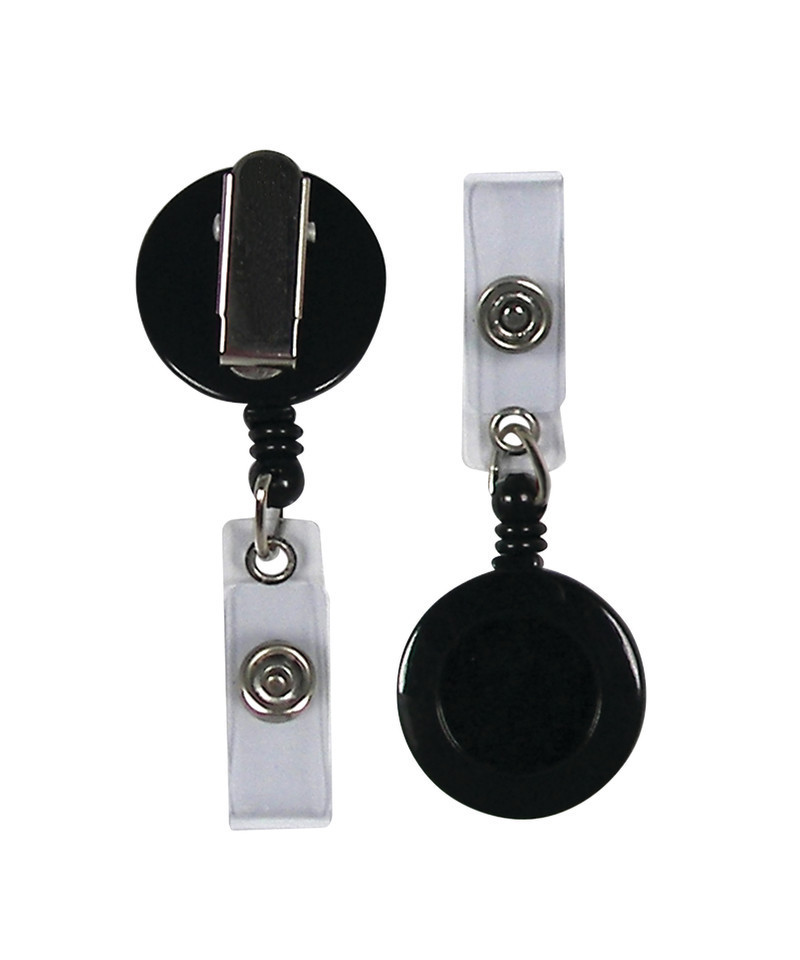Features automatic retractable 30 inch cord. Available with a swivel spring design featuring a snap-on ID strap attachment. Black.
