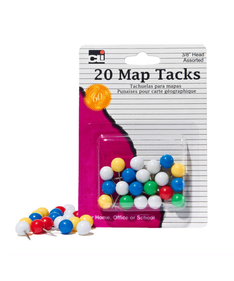 Map tacks feature 3/8" solid plastic heads with rust resistant steel pins. Ideal for pin pointing map locations. Each pack includes 20 tacks in assorted colors.