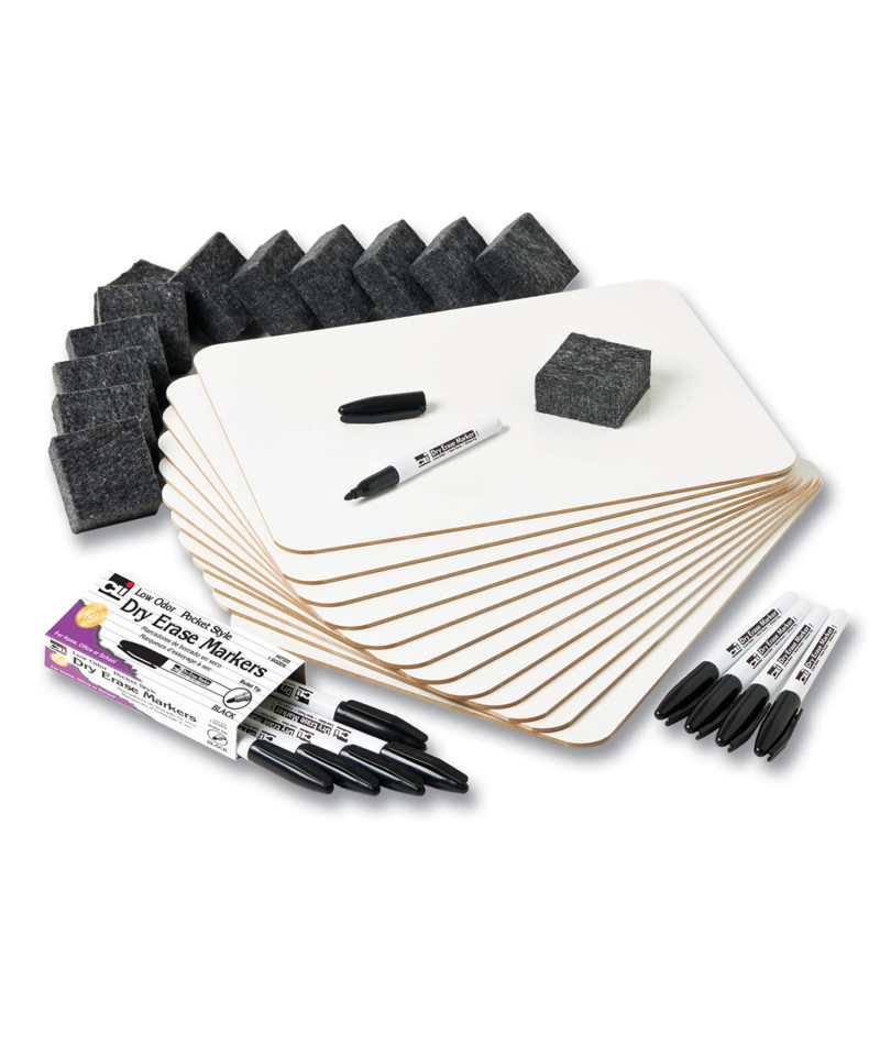 This class pack includes 12 durable magnetic masonite lap boards that are dual sided, plain white on both sides, and measure 9" x 12". Also included is a box of 12 pocket-style dry erase markers with bullet tips in black and a 12 pack of 2" multi-purpose erasers. An environment friendly way to learn, as you just write, wipe off and re-use with no waste. Markers are AP Certified, Conform to ASTM D-4236.