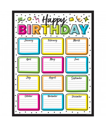 Display students' birthdays year-round on the Kind Vibes Birthday Chart. With bright colors and a "Happy Birthday" header, this 17" x 22" chart... Add to cart Carson Dellosa Education Kind Vibes Birthday Chart $3.99