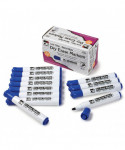 These dry erase markers are low odor but feature bold, bright vivid colors. Making sure that all your work can be seen, whether you are at the back of the class or boardroom! These dry erase markers can be used on dry erase boards, glass or any other dry erase surface. Markings will wipe away cleanly and easily using either a dry erase eraser or cloth. These barrel style markers have chisel tips and are AP Certified, NON-Toxic, conforming to all ASTM D-4236 standards. Box contains 12 blue dry erase markers.