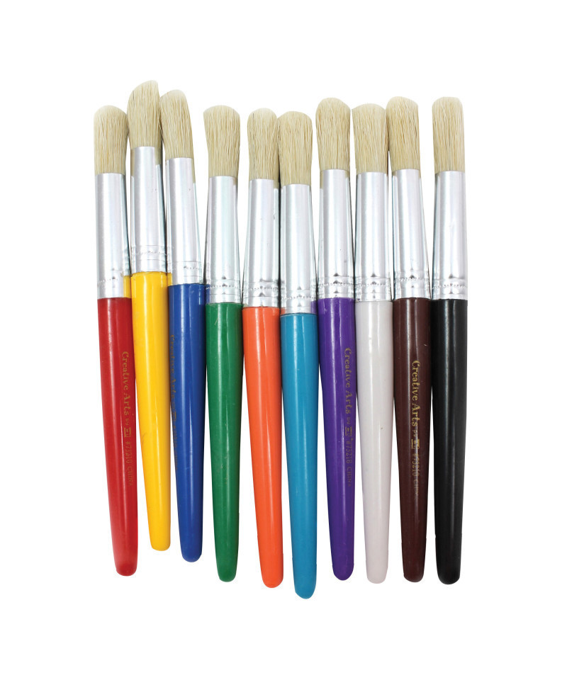 Round stubby brushes feature brightly colored 7 1/2" plastic handles. Natural hog bristles held in seamless aluminum ferrule. Color coded to match Creative Arts™ spill proof paint cups. Each pack includes 10 brushes in 10 colors: red, yellow, blue, green, orange, brown, white, black, purple and turquoise.