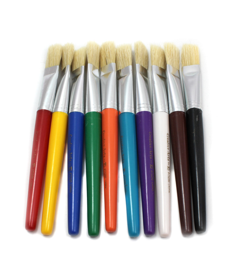 Flat stubby brushes feature brightly colored 7 1/2" plastic handles. Natural hog bristles held in seamless aluminum ferrule. Color coded to match Creative Arts™ spill proof paint cups. Each pack includes 10 brushes in 10 colors: red, yellow, blue, green, orange, brown, white, black, purple and turquoise.