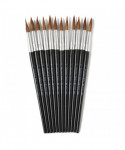 Pointed round head brushes feature dine camel hair. Seamless aluminum ferrules are double crimped to standard length hardwood handles. Great for watercolors, and all-around school, hobby and craft use. Number 12 brushes are 1-1/16" long. Each pack includes 12 brushes.