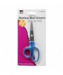Easy to hold scissors for small hands. Handles have one oblong side to allow better control. Universal design is ideal for both right and left handed use. Stainless steel blades with molded plastic handles. Pointed tip, available in assortment of red, blue and fuchsia.