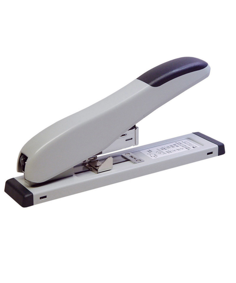 Durable steel construction with non-skid rubber feet. Locking paper guide; adjustable throat depth up to 2". Clears jams easily, also has a front loading system. Rubber-padded handle for added comfort. 100 sheet capacity, uses 1/4", 3/8" & 1/2" heavy duty staples. 5 Year Warranty.