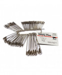 Nickel-plated steel pins with a rust-resistant finish. Features smooth, sharp points for safe and easy penetration. Each pack includes 50 safety pins in assorted sizes.