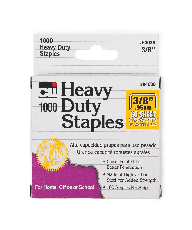 Heavy Duty chisel pointed staples are durable and perform well in most stapling machines. 3/8", 60 sheet capacity. Each box includes 1000 staples.